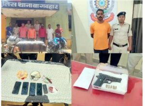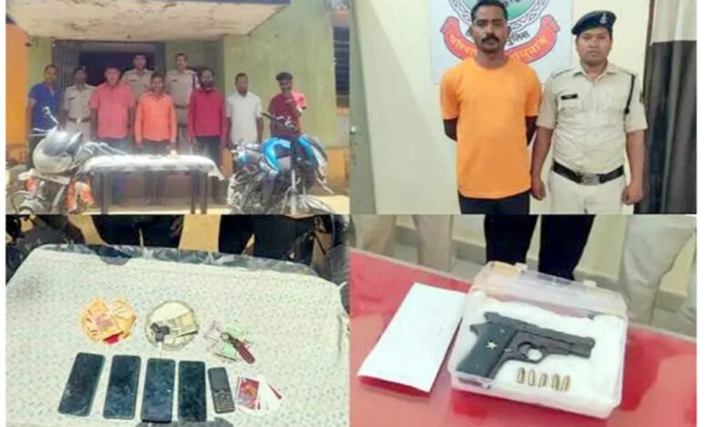 जशपुरनगर। जिला पुलिस जशपुर द्वारा विशेष अभियान चलाकर जुआ एवं आर्म्स एक्ट के आरोपियों को गिरफ्तार किया गया है। पहले प्रकरण में थाना फरसाबहार क्षेत्र के मटपहाड़ में कुछ दिनों से जुआ खेलने की शिकायत प्राप्त हो रही थी। 1 से 2 मई की मध्य रात में उक्त जगह में इन्वर्टर बल्ब जलाकर पुन: जुआ खेले जाने की सूचना मुखबीर से प्राप्त होने पर पुलिस अधीक्षक जशपुर शशि मोहन सिंह द्वारा तत्काल थाना प्रभारी बागबहार एवं चौकी प्रभारी कोतबा के नेतृत्व में विभिन्न टीमों का गठन कर आरोपियों की गिरफ्तारी एवं वैधानिक कार्यवाही हेतु निर्देशित किया गया। उक्त निर्देश के परिपालन में पुलिस टीम द्वारा मुखबीर के बतायेनुसार मटपहाड़ नामक गांव में पहुंचकर इन्वर्टर बल्ब जलाकर जुआ खेलते पाये जाने पाये पर फड़ की घेराबंदी कर दबिश दिया जाकर 05 आरोपियों को गिरफ्तार कर उनके कब्जे से जुआ का नगदी रकम, मोबाईल, वाहन, ताश-पत्ती, बल्ब इत्यादि जप्त किया गया। कुछ आरोपी अंधेरे का फायदा उठाकर वहां से भाग गये। पुलिस द्वारा आरोपी 1-जनक यादव उम्र 65 साल निवासी मटपहाड़, 2-बरत राम नाग उम्र 30 साल निवासी बगईझरिया, 3-राजेन्द्र चौहान उम्र 43 साल निवासी बहमा थाना लैलुंगा, 4-अरविंद यादव उम्र 32 साल निवासी बहमा थाना लैलुंगा, 5-घनष्याम यादव उम्र 25 साल निवासी छातासरई का कृत्य धारा 3(2) जुआ एक्ट का पाये जाने से उक्त सभी आरोपियों को गिरफ्तार कर वैधानिक कार्यवाही की गई है। पुलिस द्वारा आरोपियों से कुल नगदी रकम 29,150 /- (उनतीस हजार एक सौ पचास रू.) रू.,05 नग मोबाईल, 03 मोटर सायकल, इन्वर्टर बल्ब एवं 52 ताश-पत्ती जप्त किया गया है। प्रकरण की विवेचना कार्यवाही एवं आरोपियों को गिरफ्तार करने में थाना प्रभारी बागबहार निरीक्षक कृष्ण कुमार साहू, उप निरीक्षक समरेन्द्र सिंह, प्र.आर. 331 अरविन्द साय पैंकरा, प्र.आर. 360 विरेन्द्र सनमानी, प्र.आर. 266 सुखदेव सिदार, आर. 326 कोसमोस तिर्की, आर. 582 दिनेष यादव, आर. 628 घनष्याम प्रजापति, आर. 235 बूटा सिंह, आर. 606 पंकज तिर्की की महत्वपूर्ण भूमिका रही।