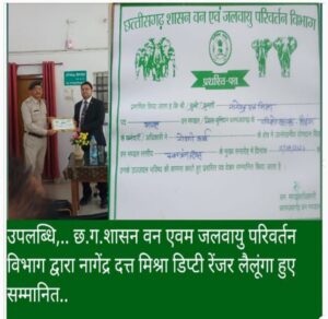 छ.ग.शासन वन एवम जलवायु परिवर्तन विभाग द्वारा नागेंद्र दत्त मिश्रा डिप्टी रेंजर लैलूंगा हुए सम्मानित..
