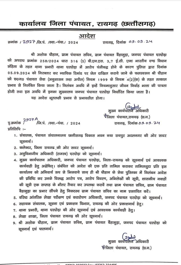रायगढ़, 10 सितम्बर 2024/ मुख्य कार्यपालन अधिकारी जिला पंचायत रायगढ़ श्री जितेन्द्र यादव ने जनपद पंचायत घरघोड़ा, ग्राम पंचायत बैहामुड़ा के पंचायत सचिव श्री अशोक चौहान को भारतीय दण्ड विधान संहिता के तहत थाना प्रभारी थाना घरघोड़ा में आरोप पंजीबद्ध होने के कारण पुलिस द्वारा गिरफ्तार कर न्यायिक रिमांड पर जेल दाखिल कराये जाने के फलस्वरूप तत्काल प्रभाव से निलंबित किया है। निलंबन अवधि में इनका मुख्यालय जनपद पंचायत घरघोड़ा निर्धारित किया गया है।