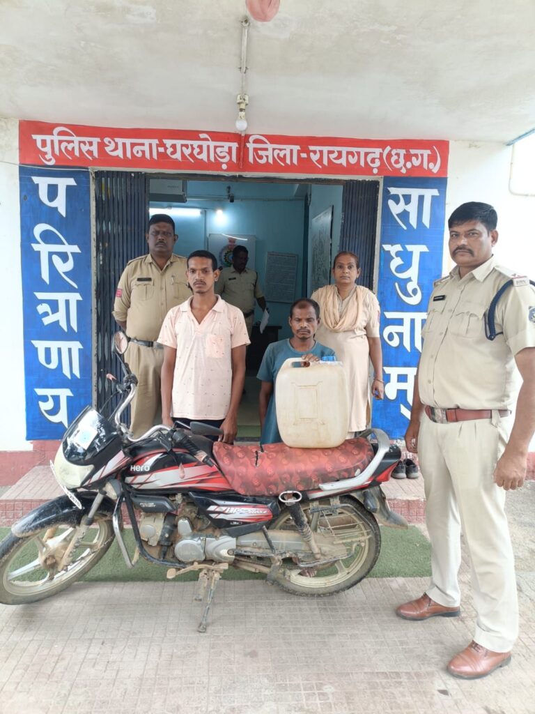 *16 सितम्बर, रायगढ़* । कल घरघोड़ा पुलिस ने मुखबिर की सूचना पर कंचनपुर तिराहा के पास अवैध महुआ शराब की तस्करी करते हुए दो व्यक्तियों को गिरफ्तार किया है। यह कार्रवाई थाना प्रभारी घरघोड़ा, निरीक्षक अमित कुमार तिवारी के नेतृत्व में की गई। पुलिस टीम में सहायक उप निरीक्षक राजेश मिश्रा और अन्य स्टाफ शामिल थे।