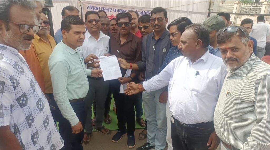 जगदलपुर ।बस्तर संभाग के जिला मुख्यालय जगदलपुर में दंतेश्वरी मंदिर प्रांगण पर बस्तर जिले के पत्रकारों ने पुलिसिया जुल्म के खिलाफ अपनी आवाज बुलंद की, पत्रकारों ने कहा कि यह आगाज़ है इस प्रकरण को अंजाम तक लेकर आगे बढ़ेंगे ,धरना प्रदर्शन के बाद एसडीएम को राज्यपाल के नाम ज्ञापन सौंपा गया।