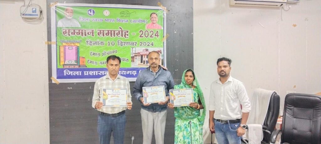 विश्व शौचालय दिवस 2024 के अंतर्गत दिनांक 19 नवम्बर 2024 से प्रारंभ होकर मानव अधिकार दिवस 10 दिसम्बर 2024 को समाप्त किया गया। जिसके तहत जिला पंचायत परिसर में सम्मान समारोह आयोजित किया गया है। इस कार्यक्रम में प्रशस्ति-पत्र हेतु रायगढ़ जिले के सभी 07 विकासखंडों के व्यक्तिगत शौचालय निर्माण हेतु 07 विकासखंडों के 07 हितग्राहियों को सम्मानित कर प्रशस्ति-पत्र एवं सामुदायिक शौचालय निर्माण हेतु 07 विकासखंड के 1-1 ग्राम पंचायतों को प्रशस्ति पत्र प्रदान किया गया है। इस अवसर पर अति. मुख्य कार्यपालन अधिकारी जिला पंचायत रायगढ़, परियोजना अधिकारी, सहायक परियोजना अधिकारी, जिला सलाहकार/ कर्मचारी (स्वच्छ भारत मिशन ग्रामीण) एवं अन्य सदस्य लोग उपस्थित रहे, और प्रशस्ति पत्र वितरण किया गया।