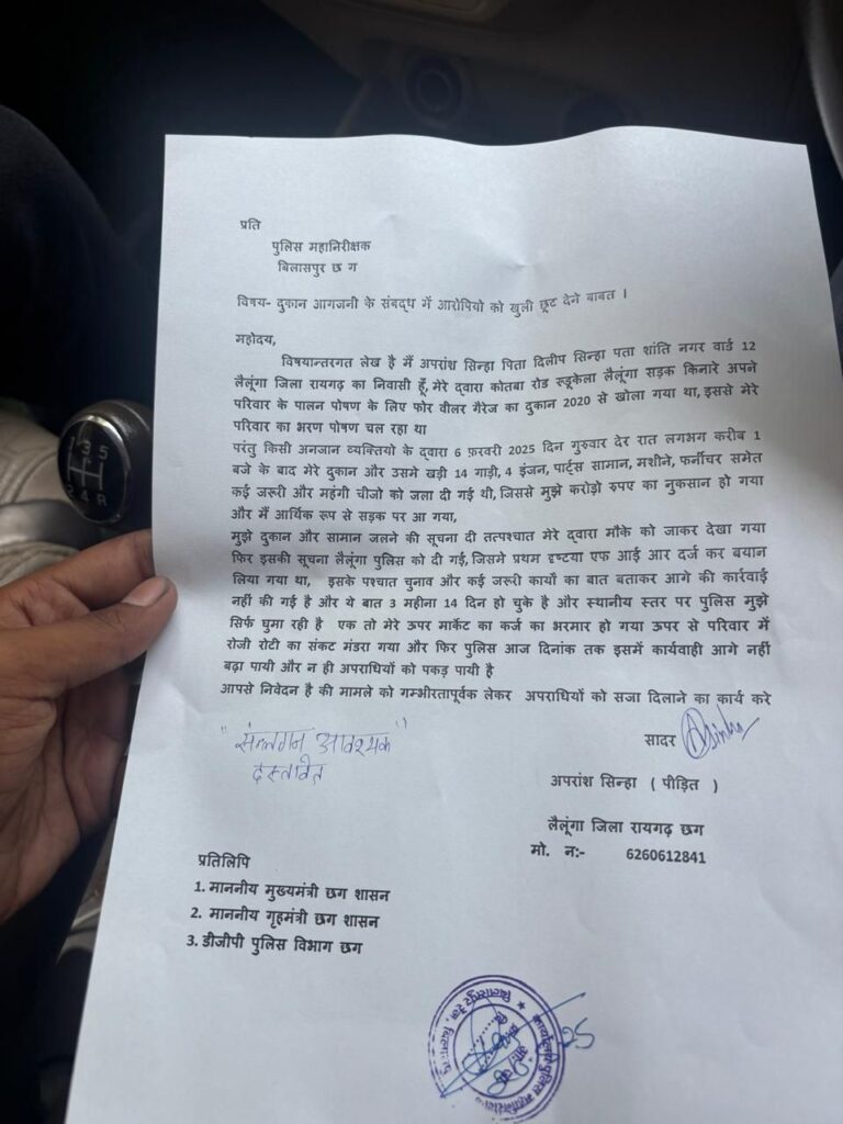 अपरांश सिन्हा, निवासी वार्ड क्रमांक 12, शांति नगर, लैलूंगा ने पुलिस महानिरीक्षक, बिलासपुर को एक शिकायती पत्र भेजते हुए इस पूरे घटनाक्रम पर गंभीर चिंता जताई है। अपने पत्र में उन्होंने लिखा है कि वे वर्ष 2020 से अपने गैरेज व्यवसाय के माध्यम से परिवार का भरण-पोषण कर रहे थे। लेकिन 6 फरवरी की रात करीब 1 बजे के बाद अचानक दुकान में आग लग गई और सब कुछ जलकर खाक हो गया। घटना की सूचना मिलते ही वह तत्काल घटनास्थल पर पहुंचे और पुलिस को सूचित किया।