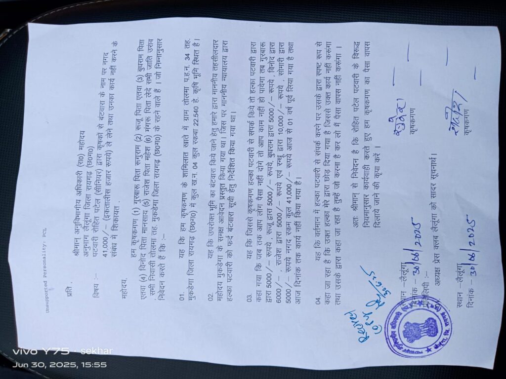 रायगढ़/लैलूंगा अनुविभागीय के राजस्व महकमे में एक बार फिर से रिश्वतखोरी और किसानों के शोषण का मामला तूल पकड़ता जा रहा है। इस बार गंभीर आरोप सीनियर पटवारी रोहित पटेल पर लगे हैं, जिन पर ग्राम तोलमा के 7 किसानों से बंटवारे के नाम पर कुल ₹41,000/- की अवैध वसूली करने का आरोप है। आरोप तो और भी गंभीर तब हो जाता है जब यह सामने आता है कि यह रकम वसूलने के एक साल बाद तक भी कोई कार्यवाही या काम नहीं किया गया, और अब पटवारी साफ तौर पर कह रहा है, “जाओ जहां जाना है, मैं पैसा नहीं लौटाऊंगा।”