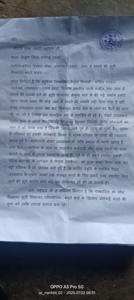क्षेत्र में अपनी निर्भीक पत्रकारिता और ईमानदार छवि के लिए पहचाने जाने वाले वरिष्ठ पत्रकार चंद्रशेखर जायसवाल को बदनाम करने का षड्यंत्र सामने आया है। सूत्रों के अनुसार, जायसवाल के खिलाफ कुछ असामाजिक तत्वों द्वारा लैलूंगा थाने में एक झूठा और बेबुनियाद आवेदन देकर उन्हें मानसिक रूप से प्रताड़ित करने का प्रयास किया गया है। उक्त आवेदन में न केवल उनके खिलाफ गलत आरोप लगाए गए, बल्कि आपत्तिजनक भाषा का भी इस्तेमाल कर उनकी प्रतिष्ठा को ठेस पहुंचाने का प्रयास किया गया।
