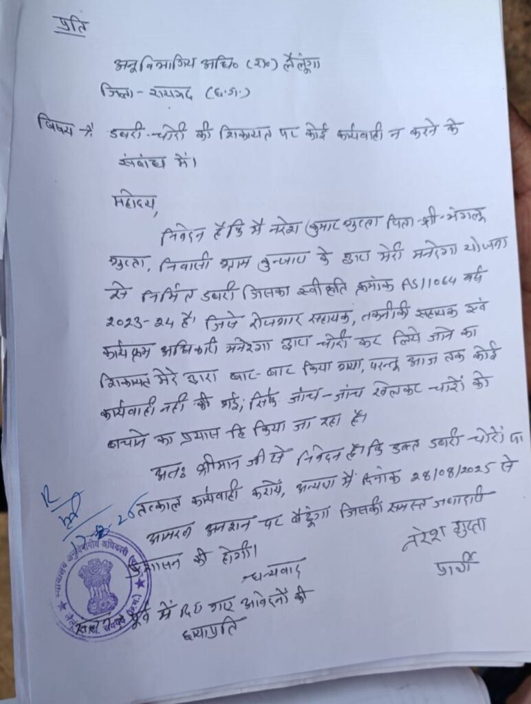 फर्जीवाड़ा उजागर होने के बाद हितग्राही ने कई बार संबंधित अधिकारियों से शिकायत की। उसने लिखित में आवेदन देकर बार-बार अपनी समस्या रखी। यहां तक कि छत्तीसगढ़ शासन द्वारा संचालित सुशासन उत्सव के दौरान भी हितग्राही ने आवेदन देकर डभरी चोरी की शिकायत दर्ज कराई।