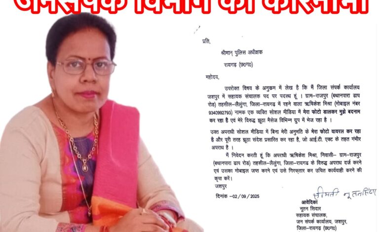 मुख्यमंत्री विष्णु देव साय के गृह ज़िले से एक ऐसा मामला सामने आया है जिसने पूरे प्रदेश की पत्रकार बिरादरी को हिला दिया है। जनसम्पर्क विभाग की सहायक संचालक नूतन सिदार ने पत्रकार ऋषिकेश मिश्र पर मानहानि का आरोप लगाते हुए पुलिस अधीक्षक रायगढ़ से FIR, मोबाइल जब्ती और गिरफ्तारी की मांग की है।
