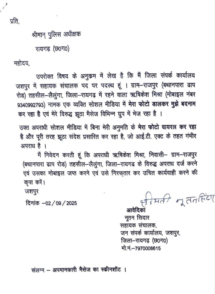 जिला सम्पर्क कार्यालय जशपुर की सहायक संचालक नूतन सिदार एक बार फिर विवादों में घिर गई हैं। इस बार उन्होंने सोशल मीडिया पर फैल रही खबरों और मैसेजों को लेकर पुलिस अधीक्षक रायगढ़ को शिकायत दी है। उन्होंने आरोप लगाया है कि रायगढ़ जिले के एक ग्रामीण युवक ऋषिकेश मिश्र उनकी फोटो और संदेश वायरल कर बदनाम कर रहा है।